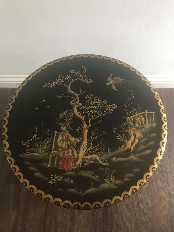 Beautiful antique (1920) black lacquered Chinoiserie coffee / side table with gilt decoration and Queen Anne style legs . Size : Top : 23.5” dia Height : 17”