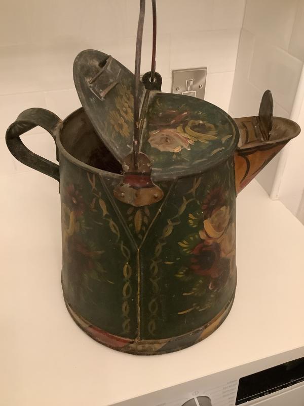 Absolutely beautiful large antique hand painted Buckby water can .