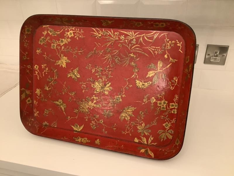 Red lacquered tray with painted in gilt with large foliage sprays and butterflies.