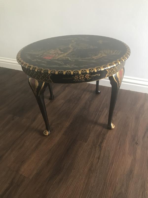 Beautiful antique (1920) black lacquered Chinoiserie coffee / side table with gilt decoration and Queen Anne style legs . Size : Top : 23.5” dia Height : 17”